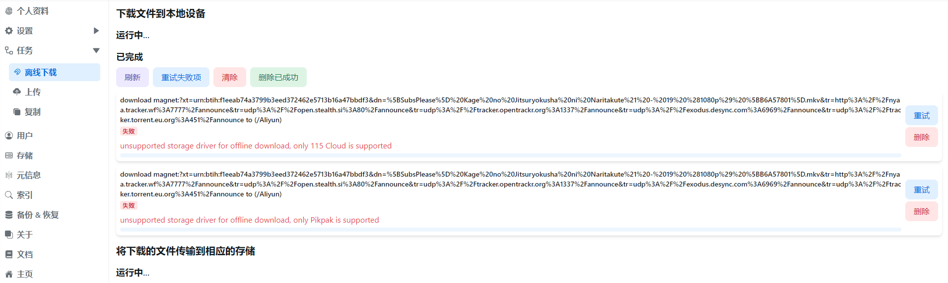 - unsupported storage driver for offline download, only Pikpak is supported